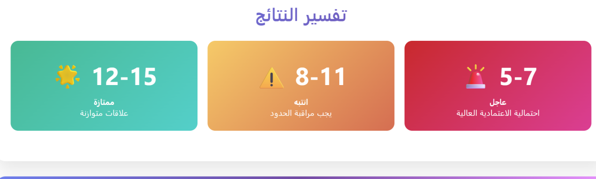 اختبار مجاني 15 سؤالاً مدعوم علمياً. قيّم توازن ولياقة ونمو علاقاتك. اكتشف الاعتمادية العاطفية وضعف الثقة بالنفس. نتائج فورية + خطة عمل.