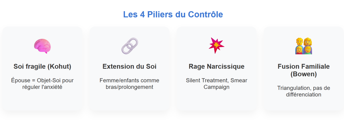 Le concept central qui explique le comportement contrôlant est celui de « l’extension du Soi ». Le mari narcissique voit sa femme et ses enfants comme des extensions matérielles et psychiques de lui-même, à l’image de la voiture de luxe qu’il conduit ou du costume qu’il porte. Cette extension signifie que tout défaut chez eux est un défaut chez lui, et toute indépendance chez eux est une amputation d’une partie de lui.