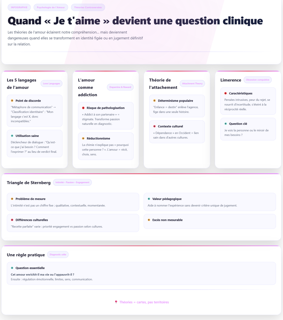 Le problème ne réside pas dans l’existence de théories expliquant l’amour, mais dans la manière dont nous les utilisons. Transformer le modèle d’« outil de compréhension » en « vérité absolue » nous fait perdre deux choses :