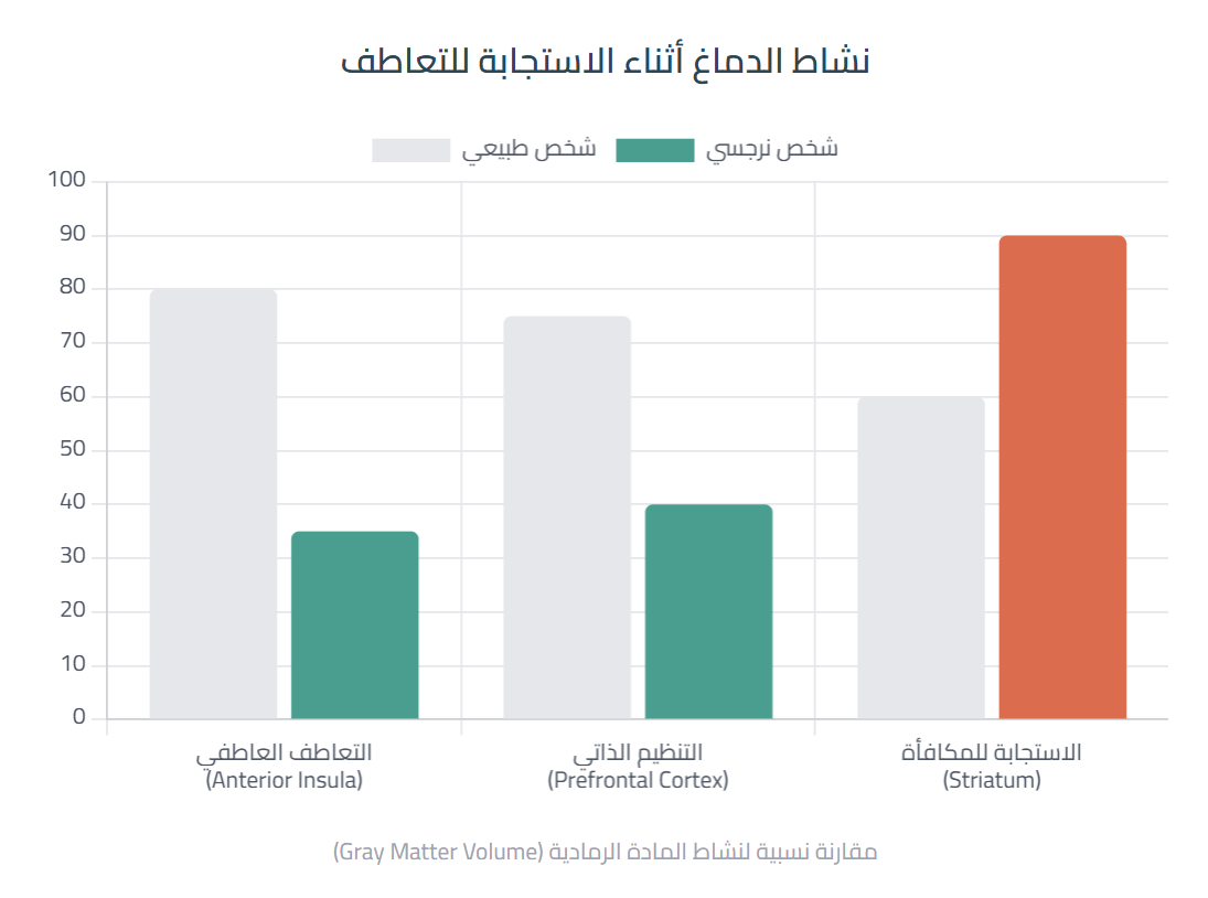 - التفسير: هذه المناطق هي نفسها التي تنشط عند الشعور بالألم الجسدي. هذا النشاط المفرط يشير إلى أن النرجسيين، خلافاً لادعائهم عدم الاكتراث (“أنا لا أهتم لرأيهم”)، يعانون من حساسية مفرطة وألم عميق جداً عند الرفض أو التجاهل.