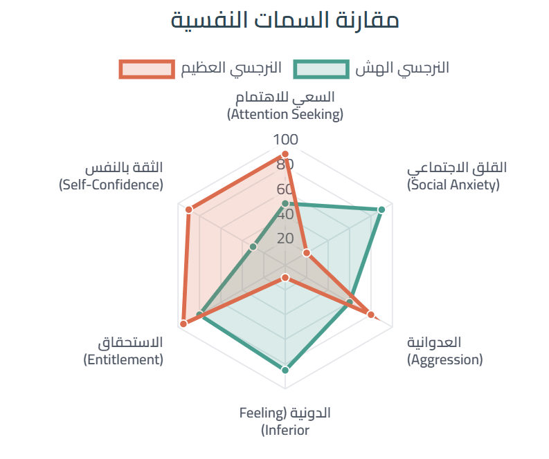 | السمات الأساسية | ثقة مفرطة، هيمنة، استعراض القوة، سعي للمكانة. | حساسية مفرطة للنقد، انطواء دفاعي، شعور بالظلم، خجل. |